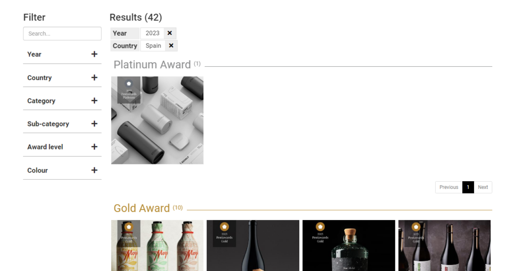 En este enlace, filtrando por año y país, se pueden ver todos los trabajos premiados Pentawards The:Portal – The Winners (ver ejemplo).