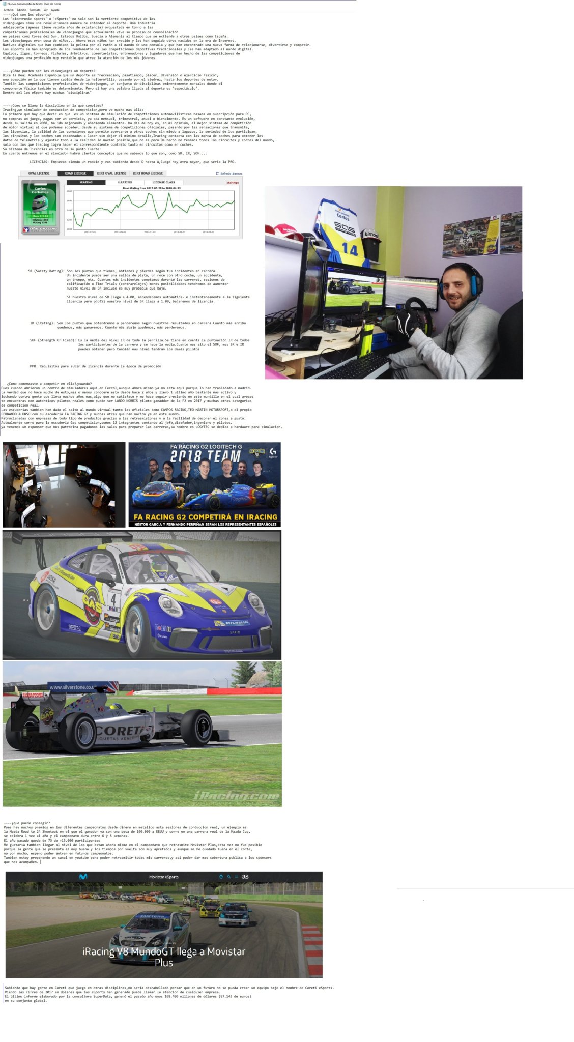 Iracing, un simulador de conducción de competición. Se trata de un eSport con un sistema de simulación de competiciones automovilísticas basado en suscripciones para PC, donde no compras un juego, si no que pagas por un servicio, ya sea mensual, trimestral o anualmente. Es un software en constante evolución, pues ha ido mejorando y añadiendo elementos desde su lanzamiento en el año 2008. A día de hoy es, en mi opinión, el mejor sistema de competición de motor virtual al que podemos acceder.