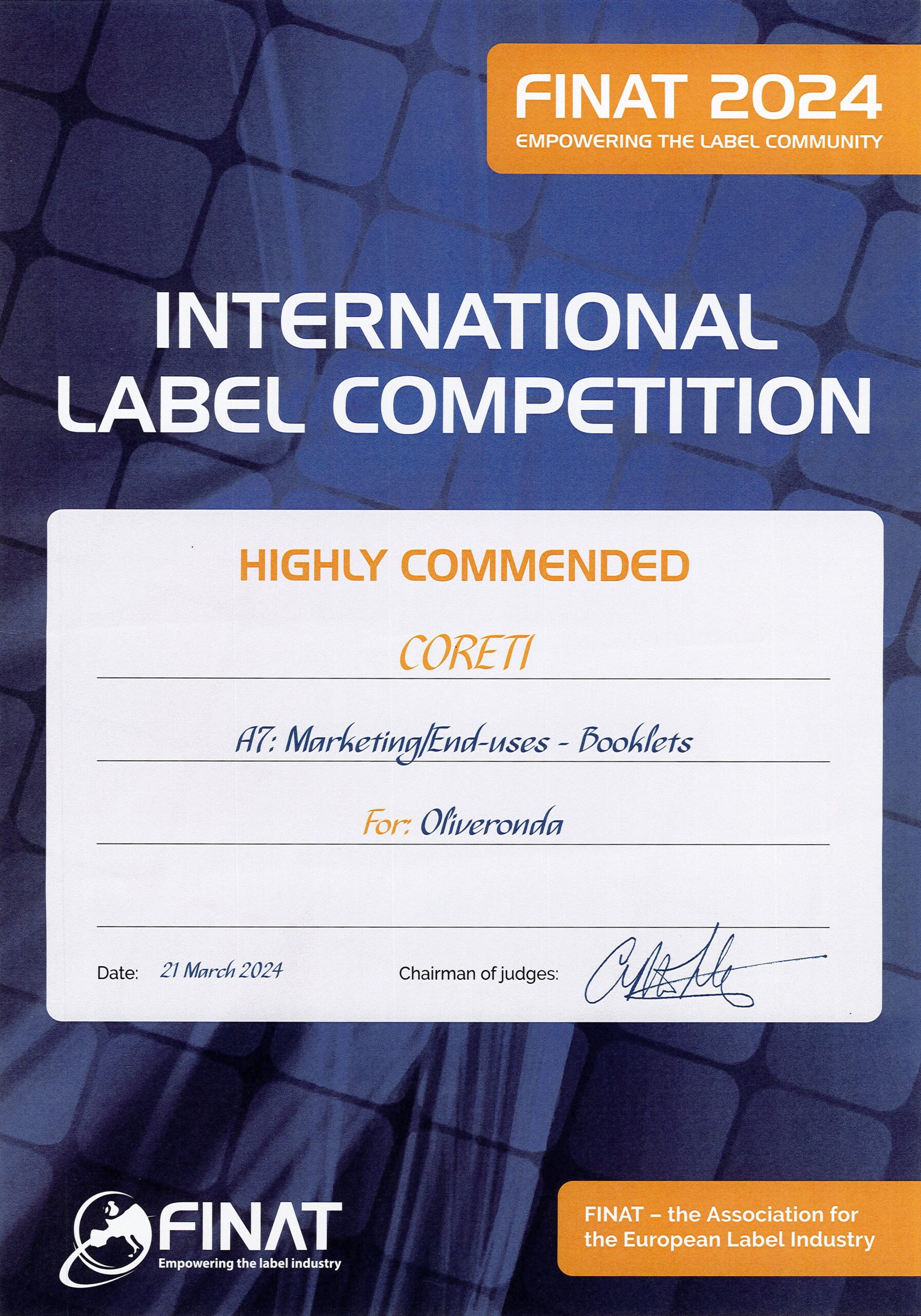 Nuestra etiqueta OliveRonda recibe una Mención Especial del Jurado tras la participación de Coreti en el 44th FINAT Label Competition 2024. Un prestigioso certamen internacional organizado por FINAT (la Asociación Internacional de la Industria Europea de Etiquetas) y que premia los mejores trabajos de la industria de la etiqueta. Este año ha contado con 236 proyectos participantes procedentes de 45 compañías distintas y de 22 países diferentes.