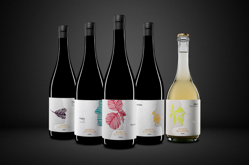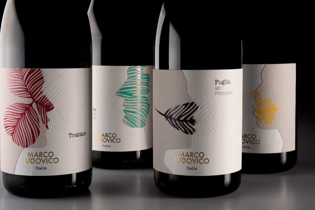 Esta original y espectacular serie de etiquetas adhesivas son obra del prestigioso e internacional estudio de diseño italiano Spazio Di Paolo. El objetivo principal era destacar las cualidades de esta colección de vinos de Marco Ludovico, que van directamente del «viñedo a la botella», libre de químicos.