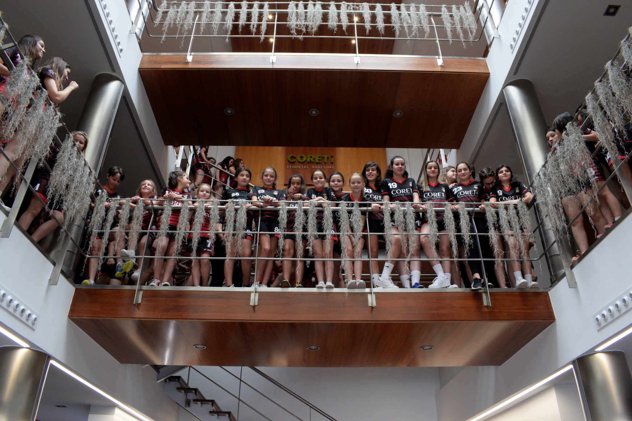 Jugadoras de los equipos femeninos del Clube Balonmán Lalín, que patrocina Coreti, acompañados de su equipo directivo y del cuerpo técnico, se acercaron hasta Bergondo para conocer nuestras instalaciones de la mano de nuestro director general, Luis Fernández Vilela.