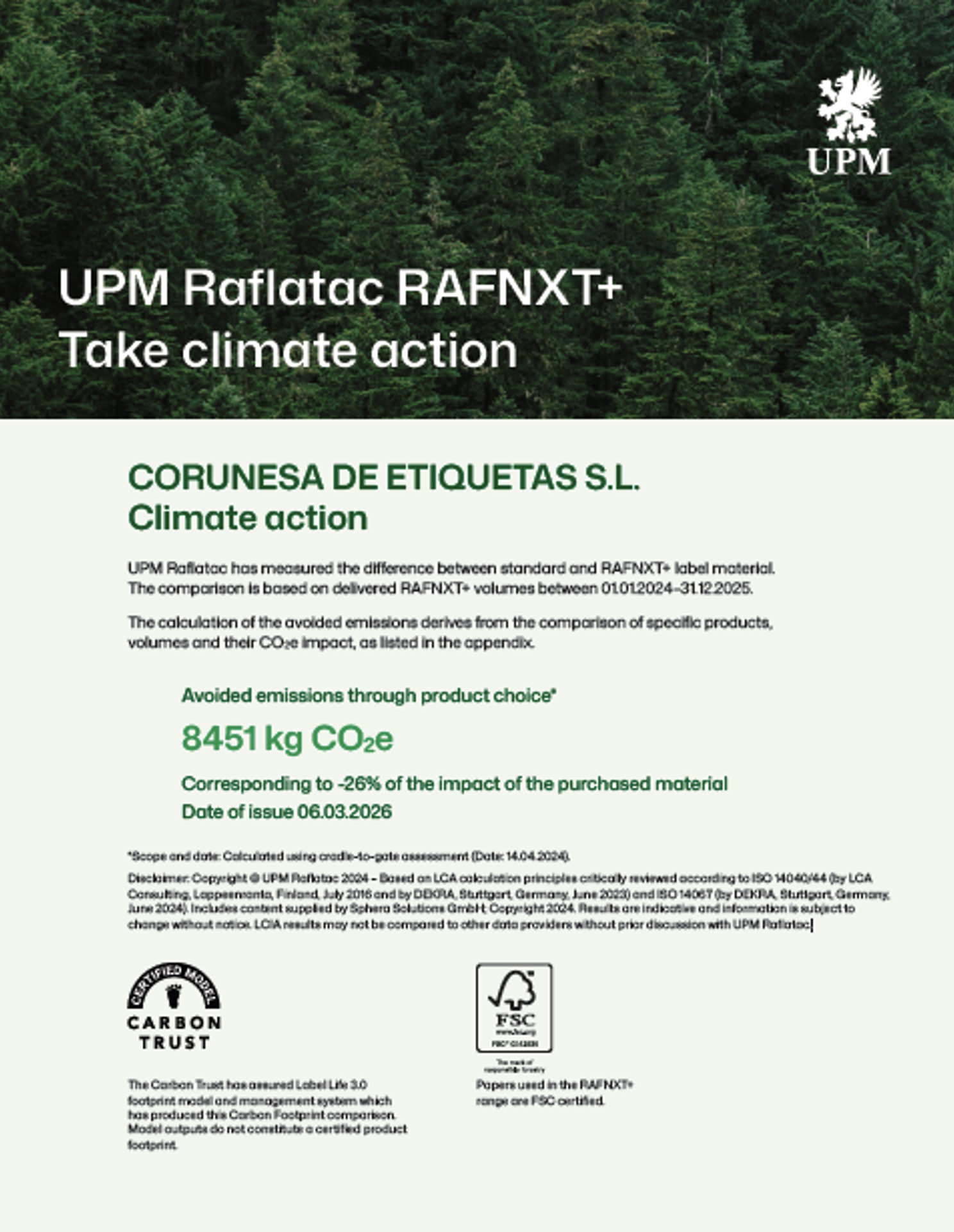 La entidad independiente Carbon Trust certifica que en Coreti hemos evitado la emisión de más de 8400 kg de CO2e (gases de efecto invernadero) a la atmosfera, por el consumo de materiales de la gama RAFNXT+ de UPM a lo largo de los ejercicios 2024 y 2025.
